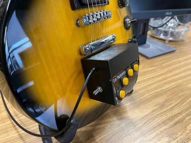 The Les Paulverizer utilizes four momentary buttons and an Arduino MKR WiFi 1010 to send MIDI data to an online interface, which then toggles a new instrument based on the button . The circuitry and code use a simple button-to-resistor topology and the Arduino.BLE library to send the outputting data to a connected Mac.